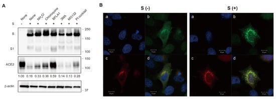 Chloroquine, NH4Cl, 3 methyl adenine (3MA), protease inhibitor cocktail, and MG132 were purchased from Sigma-Aldrich (Burlington, MA, USA). Bafilomycin A1 was purchased from Wako (Kyoto, Japan). A monoclonal antibody against the S1 domain of the SARS-CoV-2 S protein (HL1, Cat. No. GTX635656) and polyclonal rabbit antibody against the RBD region of the S protein (Cat. No. GTX135709) were purchased from GeneTex (Irvine, CA, USA). Anti-ACE2 goat polyclonal antibody (Cat. AF933) was purchased from R&D Systems (Minneapolis, Minnesota, USA). Anti-FLAG (DYLDDDK-tag) mouse mAb was purchased from FujiFilm Wako (Osaka, Japan). Anti-β-actin mouse and rabbit monoclonal antibodies were purchased from Sigma-Aldrich (Burlington, MA, USA) and Cell Signaling Technology (Danvers, MA, USA).