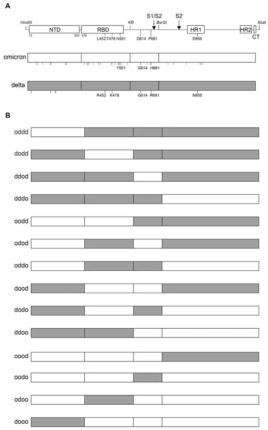 Structures of the S protein and chimeras between Omicron and Delta variants. (A) Schematic representation of the S protein structure of SARS-CoV-2 with shared restriction enzyme sites and its variants, Omicron and Delta. Only the representative mutations in the Omicron and Delta variants are shown. Other mutations are depicted in vertical bars under each S protein. (B) The structures of the chimeric S protein between Omicron and Delta variants. White and grey colors represent the S protein from the Omicron and Delta variants, respectively.