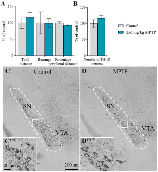 The motor behavior (A): the total distance traveled, the number of rearings, and the ratio (in %) of the distance traveled along the periphery of an open field arena to the total distance covered (“n” per group = 8); as well as the number of tyrosine hydroxylase-immunopositive neurons in the substantia nigra (SN) (B,C,C′,D,D′) (“n” per group = 3) did not change in mice 24 h after 1-methyl-4-phenyl-1,2,3,6-tetrahydropyridine (MPTP), which was administered twice at a single dose of 6 mg/kg. The white dotted line indicates the SN zone on C and D. VTA—ventral tegmental area. White box—an enlarged fragments from (C,D) is represented on (C′,D′). The data in (A,B) are presented as mean ± SEM, with control taken as 100%. Significant differences with control groups were assessed using the parametric Student’s test (A) and the non-parametric Mann–Whitney test (B). (C′,D′) Enlarged fragments from (C,D), respectively. Bar at (C,D): 200 μm, (C′,D′): 20 μm.