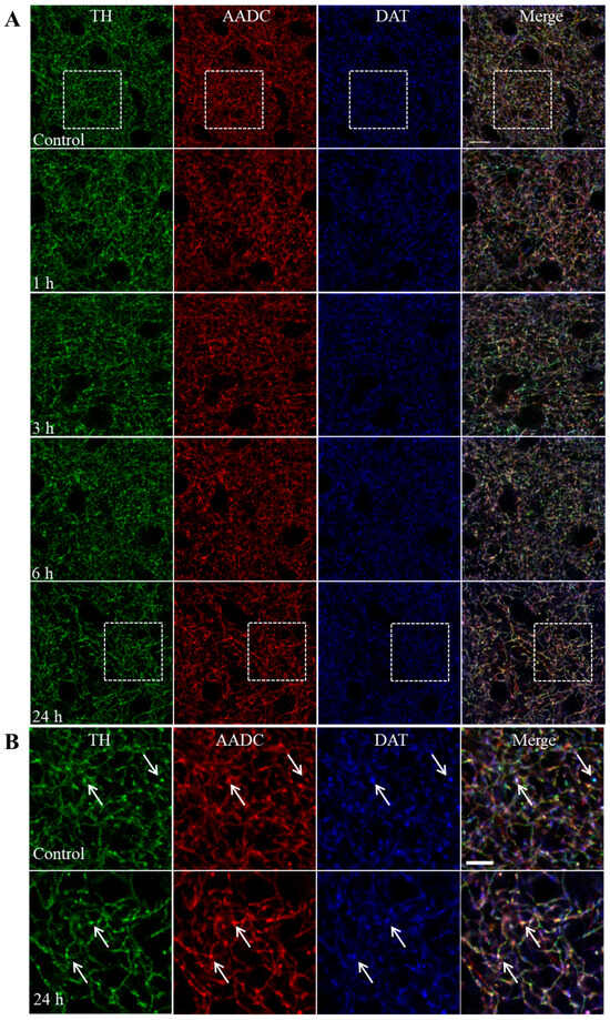Nerve fibers containing TH, aromatic L-amino acid decarboxylase (AADC), and dopamine transporter (DAT) are shown in Figure 2A,B in the striatum of mice 1, 3, 6 and 24 h after the administration of MPTP and in the control.