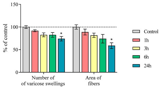 In Section 2.3, we determined the number of varicose swellings and area of nerve fibers with a diameter of 0.3 to 7 μm2 containing TH, AADC, and DAT in the striatum of mice 1, 3, 6, and 24 h after MPTP administration. The number of varicosities per 100 μm2 in the control groups was 985.6 ± 31.2, 933.8 ± 12.5, 1089.0 ± 51.3, and 1057.2 ± 50.7, respectively. The area (μm2) of the fibers per 100 μm2 in the control groups was 970.0 ± 47.8, 870.3 ± 26.9, 1178.6 ± 39.3, and 1172.9 ± 381.9, respectively (Figure 3). A significant reduction in the number of varicose swellings and fiber area was shown after 24 h following MPTP injection, amounting to 74% and 59%, respectively.