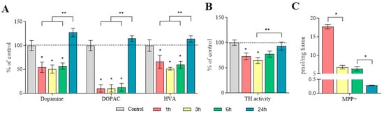The concentration (pmol/mg tissue) of DA in the striatum of the control groups was 1 h—103.1 ± 0.9, 3 h—103.9 ± 1.2, 6 h—103.5 ± 1.3, and 24 h—104.7 ± 1.5 (Table S2).
