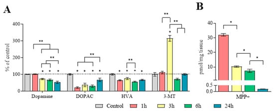 The main characteristics of the striatum as a dopamine collector and target for 1-methyl-4-phenyl-1,2,3,6-tetrahydropyridine (MPTP), 1 h after saline injections (control) and 1, 3, 6, and 24 h after twice administration of MPTP at a single dose of 6 mg/kg: (A) concentration of dopamine, 3,4-dihydroxyphenylacetic acid (DOPAC), homovanillic acid (HVA), and 3-methoxytyramine (3-MT) (“n” per group = 8); (B) concentration of 1-methyl-4-phenylpyridinium (MPP+) (“n” per group = 8). Data on the concentration of dopamine and its metabolites are presented as mean ± SEM, taken as 100% in the control. * p < 0.05 relative to the control group (A) or compared with the previous period (B) using the parametric Student’s test, ** p < 0.05 between the selected groups (A) using a one-way analysis of variance with Tukey’s test for post-analysis.