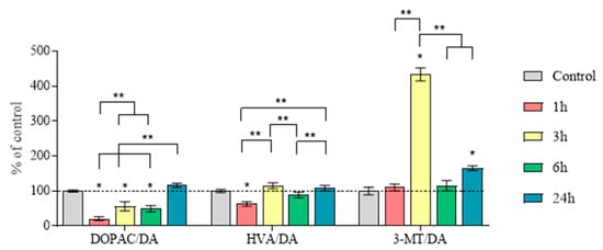 DA turnover, calculated as the DOPAC/DA ratio, was 20%, 56%, 50%, and 116% of the control levels at 1, 3, 6, and 24 h after MPTP administration, respectively (Figure 7, Table S2). Significant differences were found between all the experimental groups.