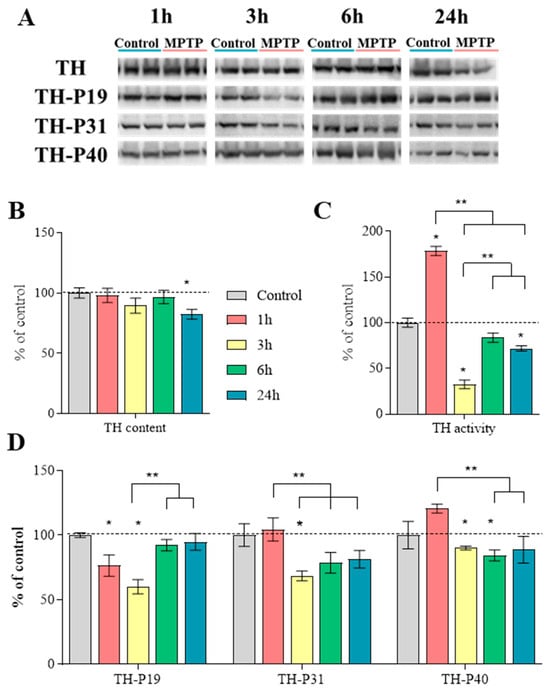The TH content did not change at 1, 3, and 6 h after MPTP administration, while at 24 h, the TH content decreased by 18% compared with the control, taken as 100% (Figure 8A,B, Table S2).