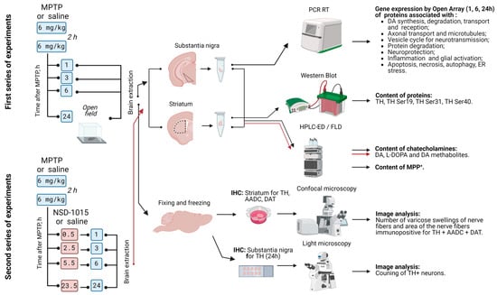Scheme of experiments with subcutaneous administration of 1-methyl-4-phenyl-1,2,3,6-tetrahydropyridine (MPTP) to mice twice at a dose of 6 mg/kg with an interval of 2 h, followed by obtaining the striatum and substantia nigra 1, 3, 6, and 24 h after the last injection and the subsequent processing and analysis of samples. AADC—aromatic L-amino acid decarboxylase; DA—dopamine; DA metabolites: 3-MT—3-methoxytyramine, DOPAC—3,4-dihydroxyphenylacetic acid, HVA—homovanillic acid; DAT—dopamine transporter; ER—endoplasmic reticulum; HPLC-ED/FLD—high-performance liquid chromatography with electrochemical and fluorescence detections; IHC—immunohistochemistry; L-DOPA—L-3,4-dihydroxyphenylalanine; MPP+—1-methyl-4-phenylpyridinium; MPTP—1-methyl-4-phenyl-1,2,3,6-tetrahydropyridine; NSD-1015—3-hydroxybenzylhydrazine; TH—tyrosine hydroxylase.