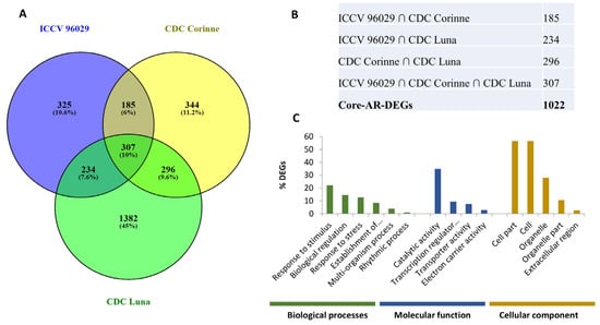 Differentially expressed genes in response to Ascochyta rabiei in ICCV 96029, CDC Corinne and CDC Luna. (A) Venn diagram showing the overlapping differentially expressed genes between ICCV 96029, CDC Corinne and CDC Luna cultivars. (B) A core set of DEGs were generated by grouping common DEGs between any two or all three cultivars as a set of genes differentially expressed in response to A. rabiei. (C) Gene Ontology (GO) enrichment analysis of core Ascochyta rabiei-responsive DEGs in three GO categories: biological processes, molecular function and cellular component.