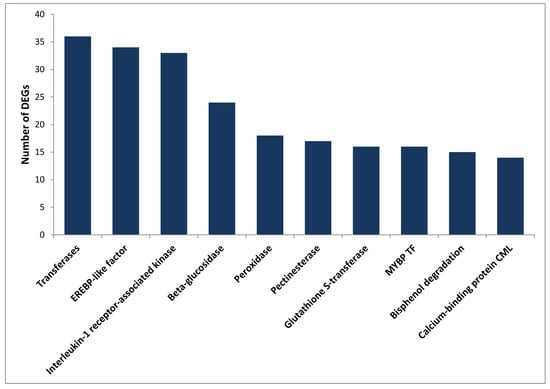 KEGG annotation of the DEGs was performed using the KAAS []. A total of 1978 (64.4%) DEGs were assigned with KO identifiers, and 131 pathways were associated with more than five KO identifiers. The major pathways included metabolic pathways (256), biosynthesis of secondary metabolites (153), plant hormone signal transduction (27), biosynthesis of amino acids (23), starch and sucrose metabolism (21) and plant–pathogen interaction (18) (Table S4). The DEGs were assigned with 914 KO terms, and the top 10 KO categories are presented in (Figure 2), while the complete list is presented in Table S4. These KO categories mainly included transferases (36), interleukin-1 receptor-associated kinase 4 (33), ERF (27), beta-glucosidase (24), peroxidase (18), pectinesterase (17) and glutathione S-transferase (16). Glucosidase, peroxidase, pectinesterase and glutathione S-transferase are classical cell wall proteins and their involvement in primary defence is well known in several plant fungal pathogen interactions []. The results of GO and KEGG annotations provide potential resources for further investigation of the process and pathway in response to A. rabiei infection in chickpea.