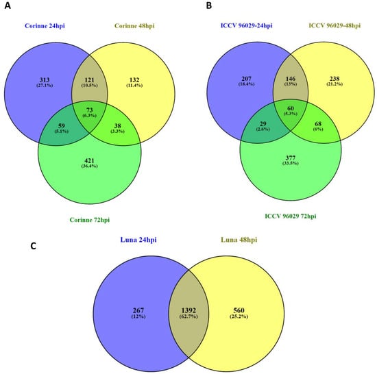 Comparative analysis of the changes in the chickpea transcriptomes in response to A. rabiei at three different time points after inoculation. Venn diagrams comparing differentially expressed genes between three different time points 24, 48 and 72 hpi in (A) ICCV 96029, (B) CDC Corinne and (C) CDC Luna.