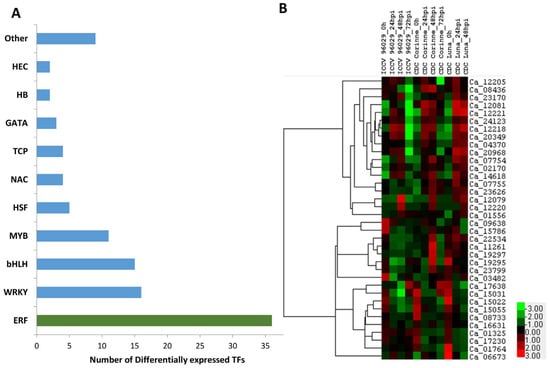 Transcription factors (TFs) are critical for the control of gene expression and their activity, which in turn determine how the cells function and respond to environmental stresses. Several classes of TFs play critical roles in response to a range of biotic and abiotic stresses. Out of 2235 known annotated transcription factors (TFs) in chickpea (PlantTFDB 4.0: http://planttfdb.cbi.pku.edu.cn/; accessed on 26 June 2020), 107 (4.8%) of the TFs were identified to be differentially expressed in response to A. rabiei in this study (Table S5). These TFs belong to 19 different transcription factor families, which mainly included 36 ethylene-responsive factors (ERF), 16 WRKY, 15 basic helix–loop–helix (bHLH), 11 MYB, 5 heat stress TFs (HSP), 4 NAC and others (Figure 4A).