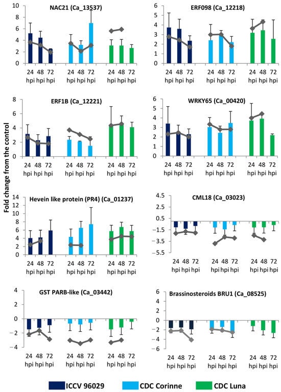 To confirm the RNA-seq results for differential gene expression, the expression patterns of a set of selected genes were assessed using RT-qPCR. The GAPDH was used to normalize the relative quantities of the target genes across the different time points and genotypes. This reference gene has also previously been found to be the most stable housekeeping gene for chickpea–A. rabiei interaction []. Overall, in the qPCR analysis, we observed general similarities and a clear pattern of differential expression (up- and down-regulation), as observed in the RNA-seq analysis (Figure 5). Genes that were up-regulated in response to A. rabiei infection such as ethylene-responsive transcription factor ERF098 (Ca_12218), WRKY transcription factor 65 (Ca_00420) in RNA-seq analysis were also found up-regulated in the qPCR analysis. Similarly, the genes that were down-regulated such as brassinosteroid-regulated protein BRU1 (Ca_08525) also demonstrated to be down-regulated in response to A. rabiei infection. There were slight differences in the fold change values, which could be due to the obvious differences in the qPCR and RNA-seq methods in terms of data collection, quantification and fold calculation.