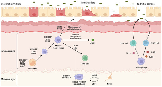 Physiological functions and intestinal effects of different IMs. The structure of the intestine can be divided into the epithelium, the lamina propria, and the muscularis, from the inside to the outside, in which intestinal macrophages are mainly distributed in the lamina propria and muscularis. Laminae propria macrophages are mostly differentiated from blood-derived monocytes. They secrete WNTs and PGE2 to maintain the integrity of the intestinal epithelial barrier, IL-10 to regulate the immune function of Treg cells, and CSF1 to maintain survival, proliferation, and differentiation. When intestinal flora erode intestinal epithelial cells, epithelial damage will be caused. At this time, laminae propria macrophages will secrete IL-12 to act on Th1 cells, while secreting IL-23 and IL-1β to act on Th17 cells, in order to activate the immune response, reduce the inflammatory response, and repair the epithelial barrier. Muscularis macrophages are principally tissue-resident macrophages, which can secrete BMP2 to support the differentiation of intestinal neurons, while intestinal neurons can secrete CSF1 to support the local maintenance of muscularis macrophages.