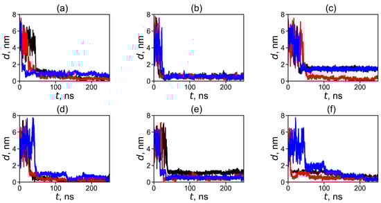 Distance between the centers of mass of the dendrimer and fullerene molecules in the system: (a) Lys-2Gly + C60, (b) Lys G2 + C60, (c) Lys G3 + C60, (d) Lys-2Gly + C70, (e) Lys G2 + C70, (f) Lys G3 + C70 at the first 250 ns of a trajectory (before and after the formation of complex). For each system, the three different initial conformations (positions of fullerene) were used and marked by different colors. The abrupt decrease in the distance reflects the formation of dendrimer–fullerene complexes.