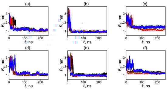 Radius of gyration (Rg) of dendrimer and fullerene in the system: (a) Lys-2Gly + C60, (b) Lys G2 + C60, (c) Lys G3 + C60, (d) Lys-2Gly + C70, (e) Lys G2 + C70, (f) Lys G3 + C70 at the first 250 ns of a trajectory (before and after the formation of complex). For each system, the three different initial conformations (positions of fullerene) were used and marked by different colors. The abrupt decrease in the radius of gyration reflects the formation of dendrimer–fullerene complexes.