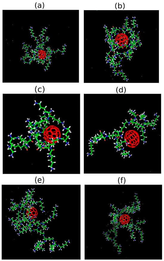 Snapshots of the dendrimer–fullerene system after 500 ns of simulation: (a) Lys-2Gly + C60, (b) Lys-2Gly + C70, (c) Lys G2 + C60, (d) Lys G2 + C70, (e) Lys G3 + C60, (f) Lys G3 + C70.