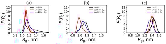 Distribution function for the radius of gyration (Rg) of an individual dendrimer (in the absence of fullerene) and complexes of the dendrimer with C60 or C70. For Lys-2Gly (a), Lys G2 (b) and Lys G3 (c).