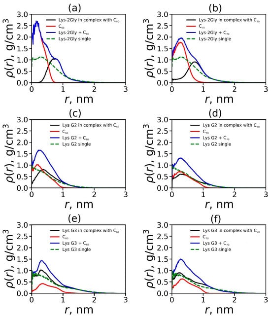 It can be clearly seen that the relative positions of the dendrimer and fullerene in different complexes differ. In the case of Lys-2Gly (Figure 5a,b), the shape of the ρ(r) curves indicates that this dendrimer encapsulates fullerene quite well. In this case, the atoms of the Lys-2Gly dendrimer are displaced from the center of the mass region by fullerene and replaced by fullerene atoms. In the case of Lys G2 (Figure 5c,d, the displacement of the dendrimer atoms from the center of mass by fullerene atoms is also observed, but it is less pronounced. As for Lys G3 (Figure 5e,f), the maxima of ρ(r) curves for the dendrimer and fullerene are observed near the same distances from the center (dendrimer and fullerene atoms coexist there).