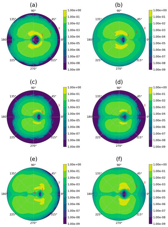 Two-dimensional sectoral radial distribution of mass of the dendrimer relative to its center of mass. The spherical sectors in which the functions were calculated using a vector directed from the center of mass of the dendrimer to the center of mass of the fullerene. The center of the sphere coincides with the center of mass of the dendrimer. The partition of a sphere into a set of spherical sectors is similar to the partition described in []. The difference is that we divided each sector into the upper (left) and lower (right) parts and calculated not only the angular distribution but also the radial distribution from the center of mass on each 2D plot. (a) Lys-2Gly + C60 and (b) Lys-2Gly + C70, (c) Lys G2 + C60 and (d) Lys-G2 + C70, (e) Lys G3 + C60, and (f) Lys G3 + C70.