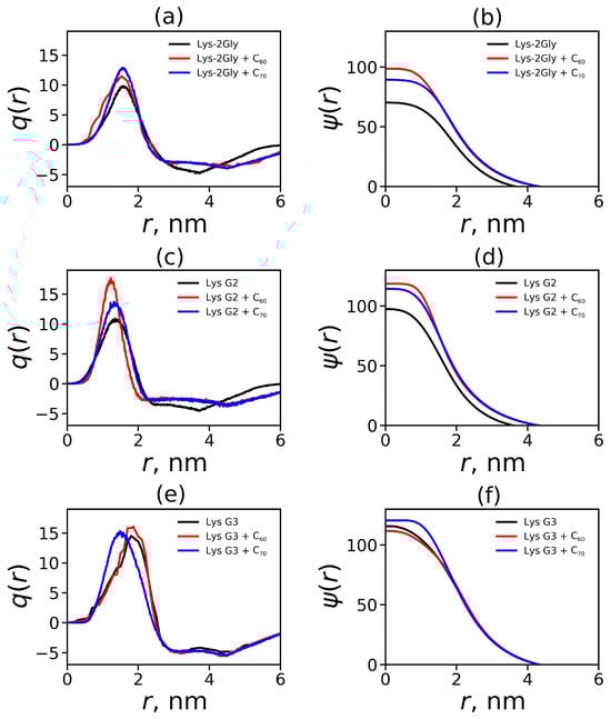 Electrostatic characteristics of the dendrimers and their complexes with fullerenes: the radial charge distribution, q(r), (a,c,e) and electrostatic potential, ψ(r), (b,d,f) for Lys-2Gly (a,b), Lys G2 (c,d), and Lys G3 (e,f).