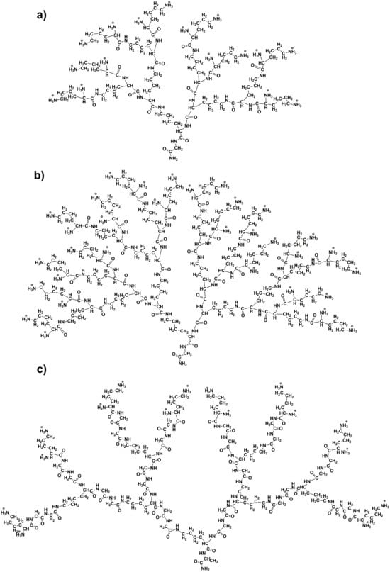 The chemical structure of (a) the lysine dendrimer of the second generation, Lys G2, and (b) the lysine dendrimer of the third generation, Lys G3; (c) the second-generation lysine-based dendrimer with double glycine (2Gly) insertions between adjacent branching points, Lys-2Gly.