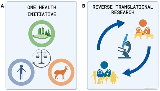 The One Medicine approach, derived from the One Health Initiative, perceives veterinary and human medicine as parts of one discipline. Therefore, clinical knowledge should be shared to benefit both human and veterinary patients. The One Medicine approach embraces the concept of reverse translation, which assumes that the data and information from human and veterinary clinical research can be translated, under the right conditions, between the biomedical fields. Veterinary patients suffering from a disease described in the human population can help to improve human patient outcomes by providing data on diagnosis, treatment, or outcomes. Conversely, information on diseases better explored in human medicine can be used to improve knowledge in veterinary medicine [14]. The diagram representing the One Medicine approach and reverse translational research is presented in Figure 1B.