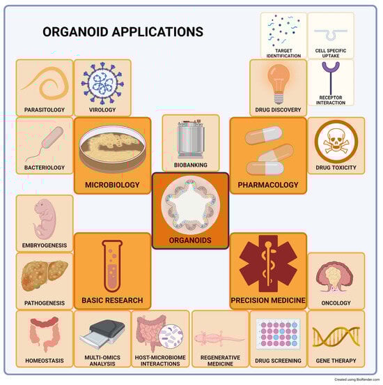 Organoids are three-dimensional (3D) stem cell-derived multicellular in vitro constructs that can reliably mimic the microanatomy and physiology of their corresponding organ [28,29]. The organoid technology can be used in numerous fields, from developmental biology, pathophysiology, drug discovery and testing, and toxicology to studying infectious diseases and regenerative medicine [30] (Figure 2).