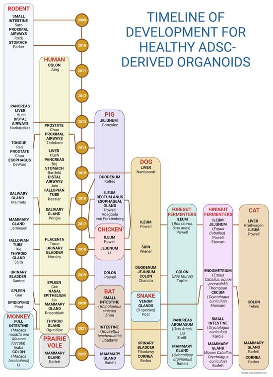 Figure 3. Timeline of Development for AdSC-derived Organoids. The timeline represents the first description of healthy organoid development in humans, rodents, and numerous other species, including traditional veterinary species and exotic animals.