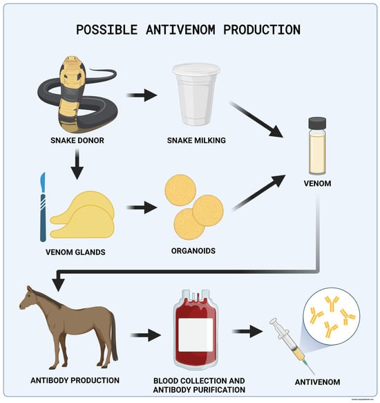 Figure 4. Possible antivenom production process. Snake venom gland organoids could be used as an alternative to laborious snake milking. The venom could be introduced into an animal, and the immunized animal could produce antibodies. The animal’s blood would be collected, and antibodies could be purified for the final product—antivenom.