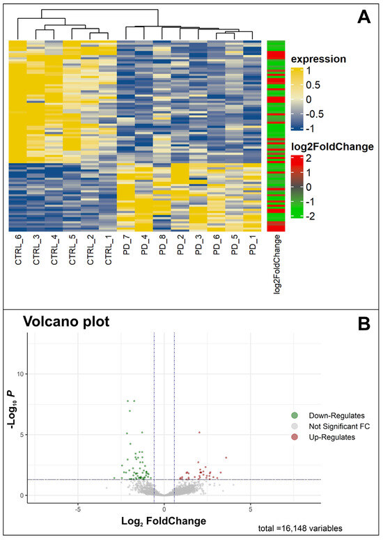 Visualization of differentially expressed genes (DEGs). (A) Heatmap of significant DEGs in patients with Parkinson’s disease (PD) and healthy control (CTRL) individuals. In yellow, we see the genes with an up-normalized expression level, whereas in blue, we see the down genes. The log2 (foldChange) bar indicates, in red and in green, the up- and down-regulated genes, respectively. (B) Volcano plot of significant DEGs based on fold changes and p-values. The green color shows the down-regulated genes, whereas the red color shows the up-regulated genes.