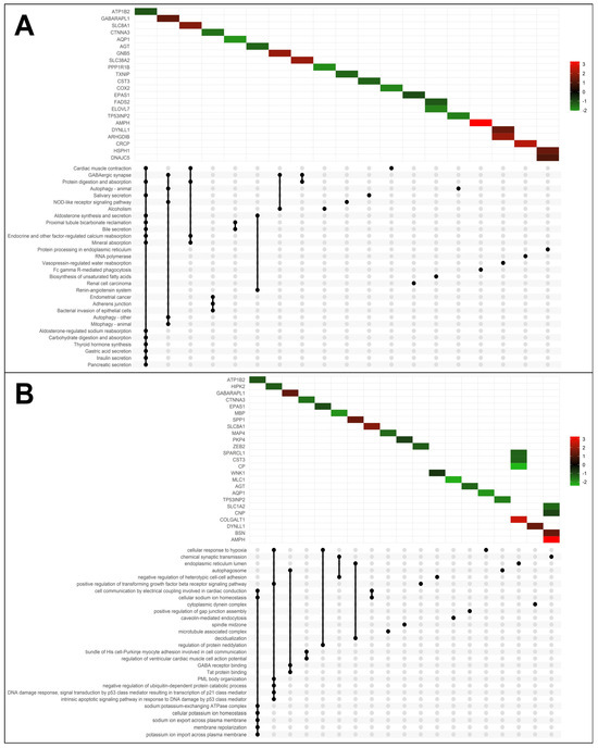 ATP1B2, a plasma membrane pump with diverse functions, including homeostasis in cell differentiation and apoptosis, is particularly expressed in the brain [48]. In our study, the ATP1B2 gene was under-expressed in PD brains compared to CTRLs (Table 1), confirming its peculiar expression in normal brains, as previously reported [49]. Following KEGG and GO enrichment analysis, ATP1B2 correlated with most of the relevant pathways observed (Figure 2A,B). Notably, in KEGG analysis, one pathway is “contraction of cardiac muscles”, while in GO analysis, ATP1B2 correlates with the “cellular communication via electrical coupling involved in cardiac conduction” pathway (Figure 2A,B).