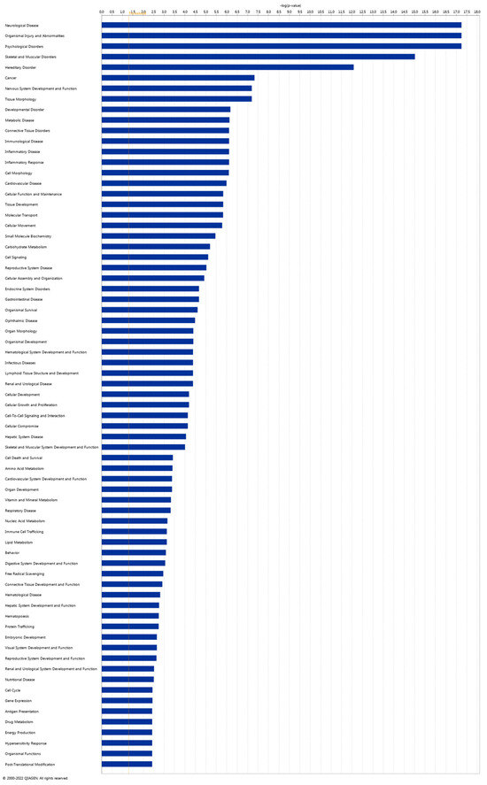 Ingenuity Pathway Analysis (IPA). Disease and Function analysis of differentially expressed genes in the IPA software (Prism version 9.4.1, 2022) with Log2 (p-value) scale.