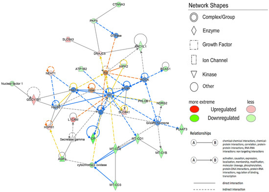 Among these, the genes most involved in the highlighted pathways, functions, and networks include ATP1B2, GABARAPL, SLC38A, mitochondrially encoded cytochrome c oxidase I (MT-CO1), mitochondrially encoded cytochrome c oxidase II (MT-CO2), mitochondrially encoded cytochrome c oxidase III (MT-CO3), mitochondrially encoded cytochrome b (MT-CYB), and cytochrome oxidase.