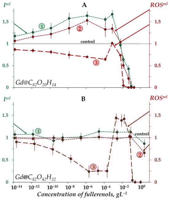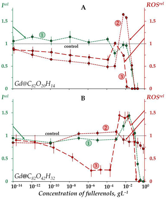 Relative bioluminescence intensity, Irel (1, green), relative ROS content in the enzymatic system, ROSrel (2, red), and relative ROS content in distilled water, ROSrel (3, red) at different concentrations of fullerenols Gd@C82O20H14 (A) and Gd@C82O42H32 (B). The time of exposure was 1 min. The ROS concentration in the control enzymatic system was 2.5 × 10−5 M and 1.9 × 10−5 M for Gd@C82O20H14 and Gd@C82O42H32, respectively; in distilled water—9 × 10−7 M and 3 × 10−7 M for Gd@C82O20H14 and Gd@C82O42H32, respectively. The “control” corresponds to the absence of fullerenols in the experimental solutions.