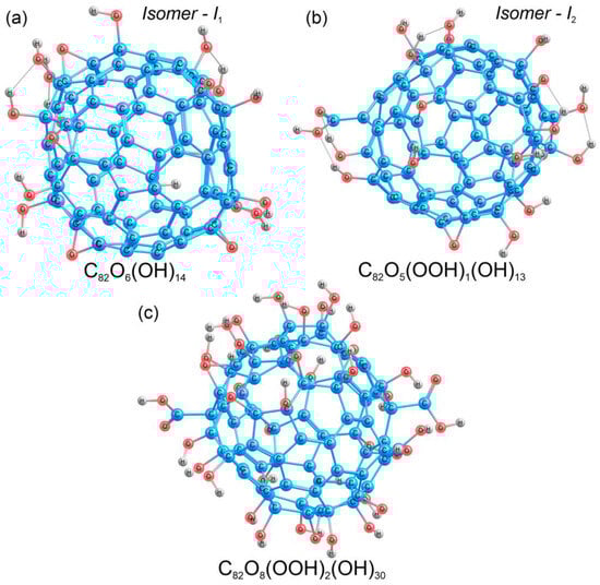 Fullerene Gd@C82 in the C2v symmetry was taken as a starting point for the construction of different structural models (Gd@C82OxHy), since the experimental value of the FTIR spectra for this molecular geometry is known. To construct the model of Gd@C82O20H14, the ratio of hydroxyl (-OH) groups to oxygen was chosen to be ~1:3, in agreement with the experimental data (see Section 3.1), the total number of oxygen atoms was 20. The structure of metallofullerene Gd@C82 has a C2v space group; thus, for the calculations, 20 oxygen atoms were distributed symmetrically on the carbon cage, and then, 14 hydrogen atoms were added to the oxygen atoms. Gadolinium was removed from the obtained models because, according to the experimental data, the spectra of gadolinium ions (700–800 cm−1) do not lie in the region of fullerenol functional groups. Next, two valence isomers of C82O20H14 were calculated, which were different in the composition and number of functional groups. The first isomer C82O20H14 (I1) contained 14 hydroxyl (-OH) and 6 carbonyl (C=O) groups (Figure 3a), distributed as eight pairs of carbonyls and hydroxyls, and two pairs of hydroxyls attached to adjacent carbon atoms. During the optimization of the geometry of the first isomer, all the carbonyl groups were converted to epoxide groups, maintaining the atomic structure of the carbon cage. As a result, the equilibrium structure of isomer I1 involved 14 hydroxyl (-OH) and 6 epoxide (C-O-C) groups (Figure 3a).