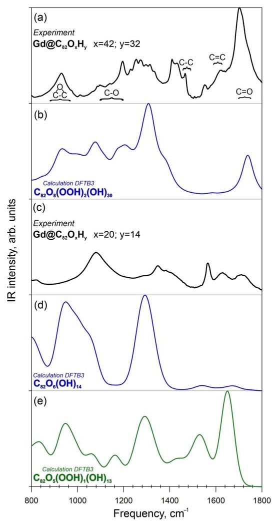 Experimental and theoretical IR spectra of Gd@C82OxHy. (a)—Experimental FTIR spectrum of Gd@C82O42H32; (b)—Theoretical IR spectrum of the compound C82O42H32; (c)—Experimental FTIR spectrum of Gd@C82O20H14; (d)—Theoretical IR spectrum of the I1-isomer C82O20H14; (e)—Theoretical IR spectrum of the I2-isomer C82O20H14.