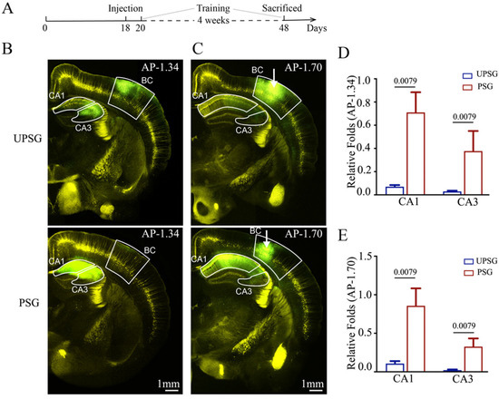 The feedback action from the hippocampus to the barrel cortex was studied by detecting the connections from hippocampal neurons to barrel cortical neurons using AAV2/retro-CMV-EGFP injected into the barrel cortices (white arrows in Figure 1C) of PSG mice (bottom panels in Figure 1B,C) and UPSG mice (top panels in Figure 1B,C). The retrograde transportation from the axonal terminals of barrel cortical neurons to their somata was examined by scanning the hippocampal CA3 and CA1 areas under a confocal microscope. The fluorescent intensities in the hippocampal CA1 and CA3 areas from PSG mice appear higher than in those from UPSG mice. The relative fluorescent strengths of EGFP-labeled neurons in the hippocampal CA1 area at anterior–posterior (AP)-1.34 mm were 0.71 ± 0.17 in PSG mice (red bar in Figure 1D, n = 5) and 0.07 ± 0.01 in UPSG mice (blue bar, n = 5, p = 0.0079). The relative fluorescent strengths of EGFP-labeled neurons in the hippocampal CA3 area at AP-1.34 mm were 0.38 ± 0.17 in PSG mice (red bar in Figure 1D, n = 5) and 0.03 ± 0.01 in UPSG mice (blue bar, n = 5, p = 0.0079). Furthermore, the relative fluorescent strengths of EGFP-labeled neurons in the hippocampal CA1 area at AP-1.70 mm were 0.86 ± 0.43 in PSG mice (red bar in Figure 1E, n = 5) and 0.11 ± 0.03 in UPSG mice (blue bars, n = 5, p = 0.0079). The relative fluorescent strengths of EGFP-labeled neurons in the hippocampal CA3 area at AP-1.70 mm were 0.33 ± 0.11 in PSG mice (red bar in Figure 1E, n = 5) and 0.02 ± 0.01 in UPSG mice (blue bar, n = 5, p = 0.0079).