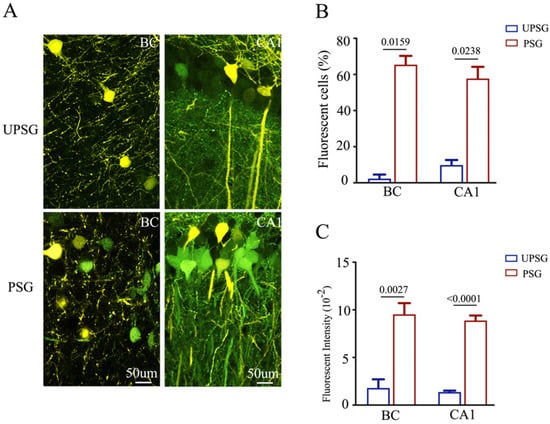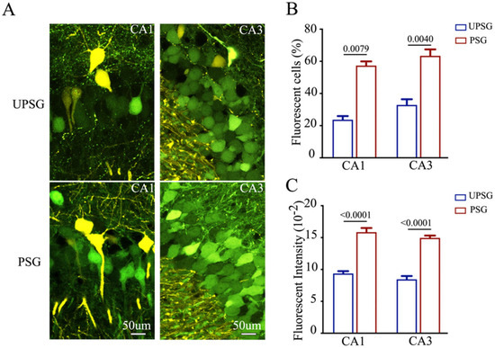 In the quantification of the retrograde neural tracing that showed axon projections and neuron somata, the neural tracing was compared between the source area where neuronal somata were located and the target area where axonal terminals are located. All fluorescence intensities are presented as relative values. Initially, the background of each image was removed using Image J. Subsequently, the relative fluorescence intensity of a defined region of interest (ROI) was measured. In the analysis of confocal images at low magnification, the multiplication of fluorescent intensity and area size were used as parameters showing the labeling of neurons and axons. In this way, the effects of different microinjection area sizes on the results between PSG and UPSG mice could be eliminated. In the comparisons, the differences between PSG and UPSG were calculated based on the division of the parameters in neuronal source areas by those in the axonal target area. The application of this relative alternation (relative folds in the Y-axis), which was also called the relative fluorescent strength of GFP-labeled neurons, could rule out the influence of microinjection area size and virus quantity on differences in results between PSG and UPSG [6]. In the analysis of confocal images at high magnification, the parameters used to show the labeling of neurons were the number of GFP-labeled neurons per slice section under the 60× magnification to indicate the number of associative memory cells as well as the average fluorescent intensity in each of EGFP-labeled neurons to show their activity strength after associative memory formed. In general, the strength of neuron activity was positively proportional to the expression levels of genes and proteins [6,70].