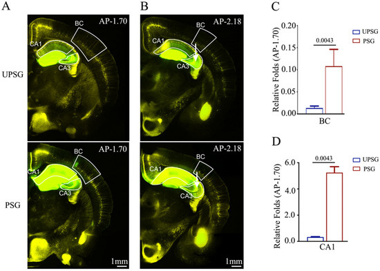 We also examined the feedforward action by the connection from barrel cortical neurons to hippocampal CA1–3 neurons during associative memory using AAV2/retro-CMV-EGFP microinjected into the hippocampal CA3 area (white arrows in Figure 3B) in PSG mice (bottom panels in Figure 3A,B) and UPSG mice (top panels in Figure 3A,B). The retrograde transportation from the axon terminals of hippocampal CA3 neurons to their somata was examined by scanning the barrel cortices and hippocampal CA1 under a confocal microscope. Fluorescent intensities in barrel cortices and hippocampal CA1 from PSG mice appear higher than in those from UPSG mice. The relative fluorescent strengths of EGFP-labeled neurons in the barrel cortex at AP-1.70 mm were 0.11 ± 0.04 in PSG mice (red bar in Figure 3C, n = 5) and 0.01 ± 0.001 in UPSG mice (blue bar, n = 6, p = 0.0043). The relative strengths of EGFP-labeled neurons in the hippocampal CA1 area at AP-1.70 mm were 5.25 ± 0.45 in PSG mice (red bar in Figure 3D, n = 5) and 0.33 ± 0.03 in UPSG mice (blue bars, n = 6, p = 0.0043).