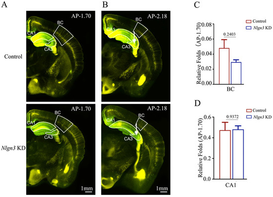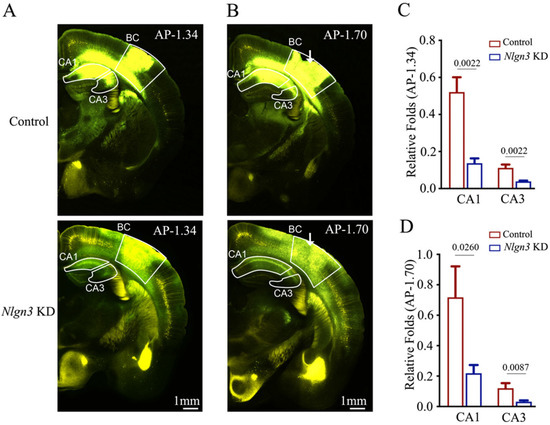 The data presented above support the view that associative learning and memory are based on new axon projections and synapse innervations by the coactivity among neurons, or their activity and interconnection [6]. To examine the causal relationship between new synapse interconnection between the sensory cortices and the hippocampal CA3 area for associative memory as well as its molecular mechanisms, we utilized the approach of knocking down the molecules relevant to synapse formation and linkage, such as neuroligin-3, one of the synapse linkage proteins [42,43,44,45,46]. Neuroligin-3 knockdown was conducted by shRNA specifically for neuroligin-3 carried by adeno-associated viruses (AAVs) and microinjected in cortical areas [58,59,60,61,62]. The microinjections of AAV-DJ/8-U6-mNlgn3-GFP [pAAV(shRNA)-U6-mNlgn3-EGFP] into the barrel cortex or hippocampal CA3 region were conducted two days before the paradigm of associative learning. After the paradigm of associative learning, the mice in the subgroups of neuroligin-3 knockdown and shRNA-scramble control were examined in terms of their synapse innervations on the hippocampus and the barrel cortex.