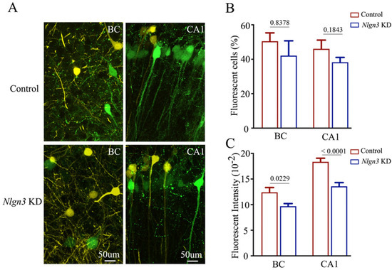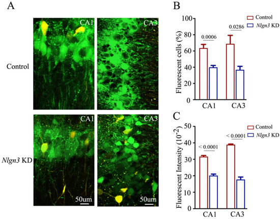 2.4. The Knockdown of Neuroligin-3 in Hippocampal CA3 Attenuates the Connections from the Barrel Cortex to Hippocampal CA3, but Not from Hippocampal CA1 to CA3
