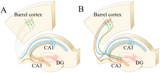 Our study indicates that there are no synapse connections to hippocampal CA3 neurons from barrel cortical and hippocampal CA1 neurons under normal conditions (Figure 3 and Figure 4). This observation is consistent with those of previous studies [73,74,75,76]. However, new connections from barrel cortical neurons and hippocampal CA1 neurons to hippocampal CA3 neurons emerge during learning and associative memory. In addition to supporting a view of the activity and interconnection of synapses [6], this result implies that associative memory induces more interconnections among different brain regions for the enrichment of cognitive activities and emotional reactions [6].