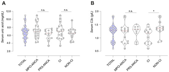 Serum UA and complement C3 levels in the total cohort and subgroups of patients with ANCA-associated renal vasculitides. (A,B) Violin plots with medians and data points for serum UA levels (A) and serum complement C3 levels (B) in ANCA-associated renal vasculitis; in the total cohort and subgroups MPO-ANCA, PR3-ANCA, CI and non-CI. Subgroup comparison was performed between MPO-ANCA and PR3-ANCA, with CI and non-CI. Abbreviations: ANCA, anti-neutrophil cytoplasmic antibody; C3, complement factor 3; CI, critically ill; MPO, myeloperoxidase; PR3, proteinase 3; UA, uric acid. * p < 0.05, n.s. not significant.