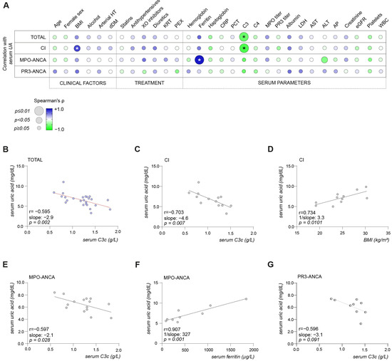Serum UA levels are associated with decreased complement C3 levels, especially in critically ill patients with ANCA-associated renal vasculitides. (A) Correlation matrix shows mean values of Spearman’s/Pearson’s r; significant p values in the Pearson’s/Sperman’s correlation are marked with an asterisk, and circle size represents significance level in the stepwise multivariable linear regression. (B–G) Simple linear regressions between serum UA levels and serum parameters in the total cohort (B), CI (C,D), MPO-ANCA (E,F), PR3-ANCA (G). Slope is indicated by a red line. Abbreviations: ALT, alanine aminotransferase; ANCA, anti-neutrophil cytoplasmic antibody; AP, alkaline phosphatase; arterial HT, arterial hypertension; AST, aspartate aminotransferase; BMI, body mass index; C3, complement factor 3; C4, complement factor 4; CI, critically ill; CRP, C-reactive protein; dDM, decompensated diabetes mellitus; eGFR, estimated glomerular filtration rate; KRT, kidney replacement therapy; LDH, lactate dehydrogenase; MPO, myeloperoxidase; PCT, procalcitonin; PEX, plasma exchange; PR3, proteinase 3; UA, uric acid; WBC, white blood cells; XO inhibitors, xanthine oxidase inhibitors.