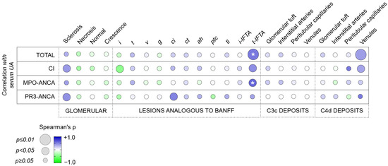 Tubulitis in areas of scarred cortex correlates with serum UA levels in ANCA-associated renal vasculitides. Correlation matrix shows mean values of Spearman’s/Pearson’s r; significant p values in Pearson’s/Spearman’s correlation are marked with an asterisk, and circle size represents significance level in the stepwise multivariable linear regression. Abbreviations: ah, arteriolar hyalinosis; ANCA, anti-neutrophil cytoplasmic antibody; CI, critically ill; ci, interstitial fibrosis; ct, tubular atrophy; g, glomerulitis; i, interstitial inflammation; IFTA, interstitial fibrosis/tubular atrophy; i-IFTA, inflammation in areas of IFTA; MPO, myeloperoxidase; PR3, proteinase 3; ptc, peritubular capillaritis; t, tubulitis; ti, total inflammation; t-IFTA, tubulitis in areas of IFTA; UA, uric acid; v, intimal arteritis.
