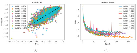 (a) scatter plot and (b) validation loss from ten-fold cross-validation.