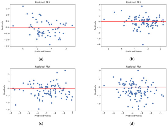 Residual plots for test sets: (a) Cui et al.; (b) Lovric; (c) Boobier; (d) Llinas.