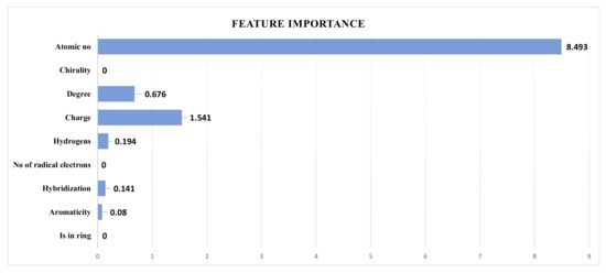 GNNs have become popular for processing graph-structured data. Because of the complexity of graph-based data and the nonlinear interactions between graph nodes, it might be difficult to explain why a GNN generates a specific prediction. Hence, there are explanatory problems for GNNs, and it is difficult to explain how these models make predictions. GraphFramX [42] provides explainability techniques. Traditionally there are two ways to explain GNNs, local explanation and second global explanation. Local explanation emphasizes a single node or edge, whereas the global approach uses the overall GNN behavior. Herein, local phenomena were used for SolPredictor explanation. We used the Pyg captum explainability module to explain the feature importance. The model configurations were regression, graph, and raw for the mode, task level, and return type, respectively. SolPredictor uses nine types of node features. As shown in the Figure 3, the explainability mechanism shows that the atomic number is the most important node property.