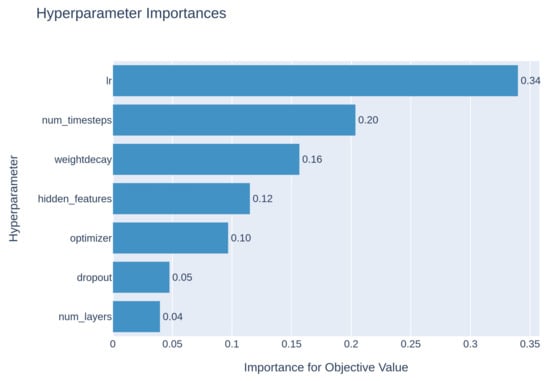 The best model architecture for a specific model is not always clear. Therefore, we investigated several choices. In a typical machine learning method, the machine is tasked to help with this exploration and to dynamically select the optimal model architecture. The hyperparameters determine the model architecture, and the process of obtaining the best model architecture is known as hyperparameter tuning. The hyperparameters were tuned for the SolPredictor using Optuna [43]. Optuna is a software (v.3.5.0) framework that facilitates automatic hyperparameter adaptability. The hyperparameters for SolPredictor are the learning rate, weight decay, optimizer, hidden features, number of layers, number of time steps, and dropout. The hyperparameter ranges are presented in the Supplementary Materials. As shown in Figure 4, the learning rate is the most important hyperparameter, whereas the number of layers has the least effect on the model.