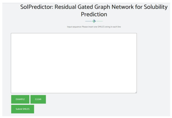 Finally, a web server was developed for researchers and pharmaceutical industry experts. The server was based on a residual graph convolution model. The page takes SMILES list input, then calculates and shows predictions. The web server is demonstrated in Figure 5. The web server tool is available at https://nsclbio.jbnu.ac.kr/tools/SolPredictor/ (accessed on: 2 January 2024).