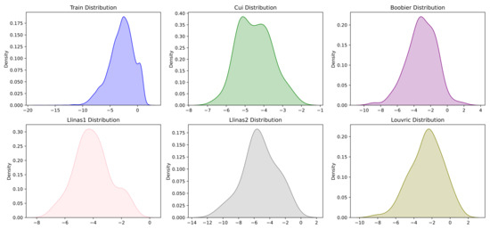 Boxplots for training, validation, and five test datasets. The training dataset had a median at −2.8, maximum at 2.3, and minimum at −8, with outliers at −9 to −17.5.